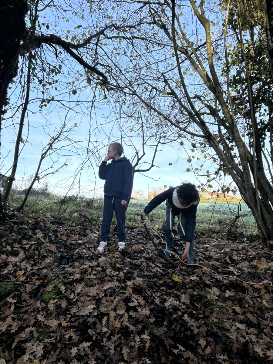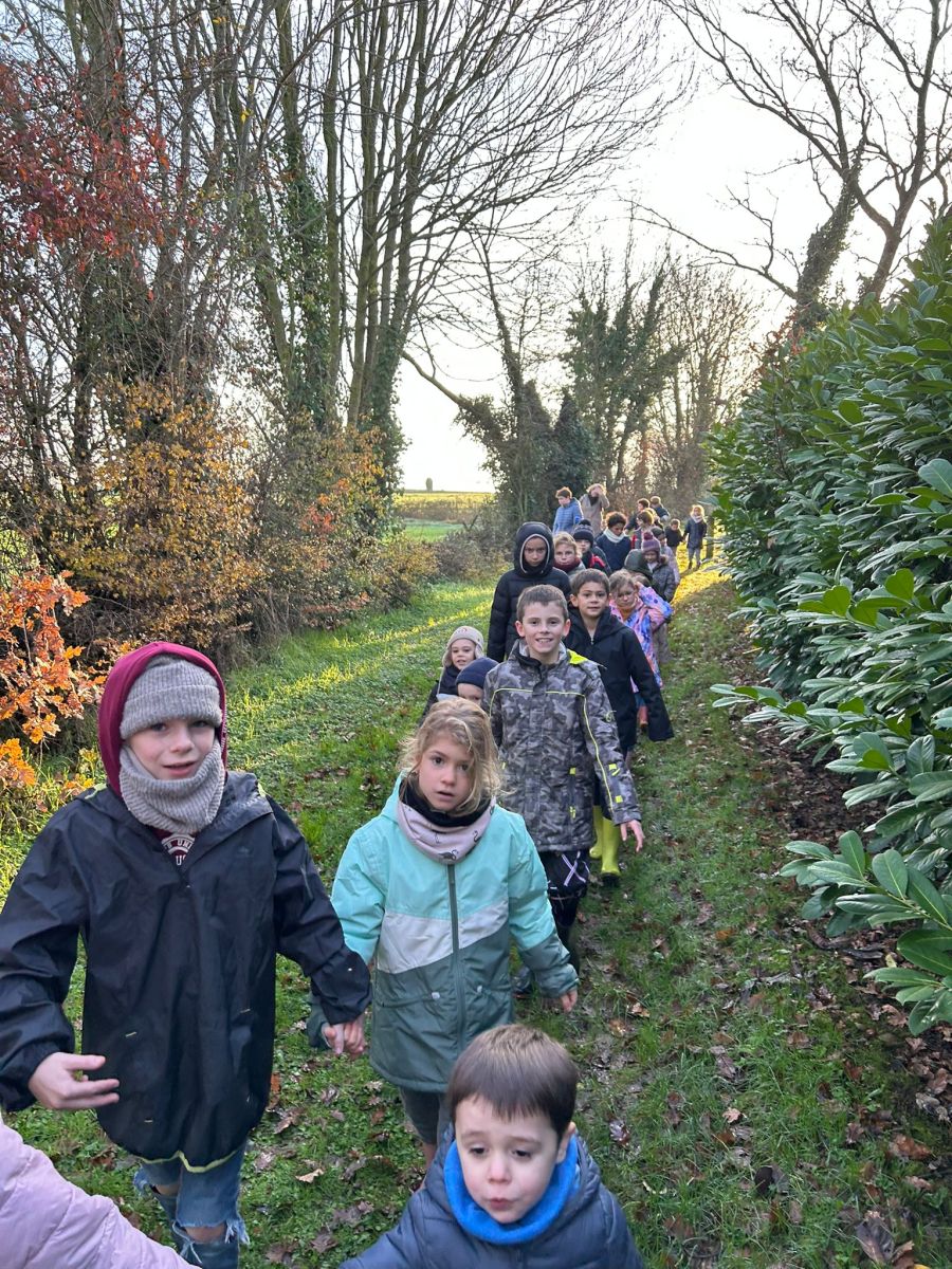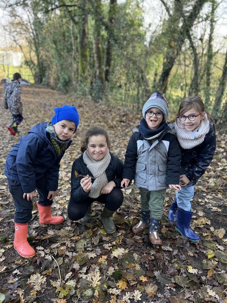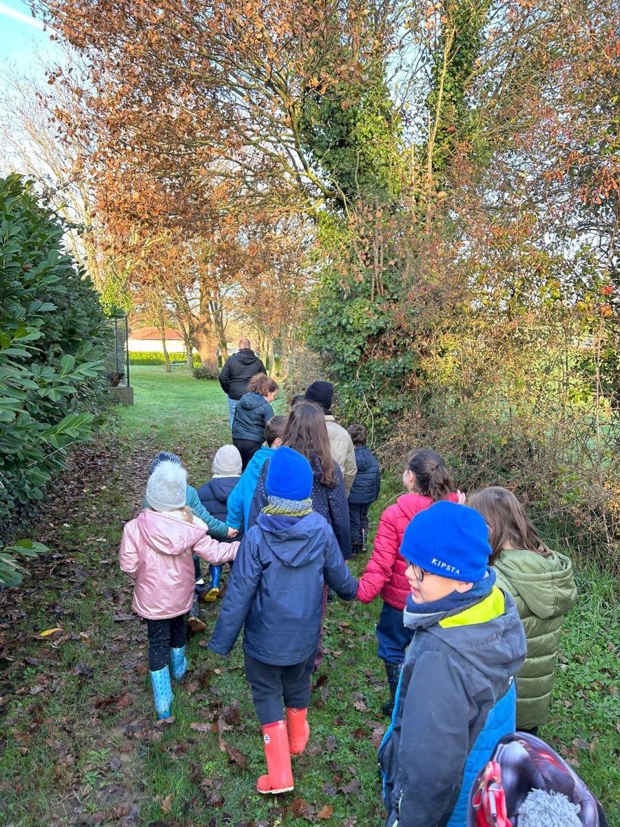 Tous les enfants de l’école se sont réunis pour partager la deuxième matinée « école dehors » de l’année. Nous avons marché dans les chemins de la commune. Sur notre parcours, nous nous sommes arrêtés plusieurs fois afin de réaliser des ateliers.