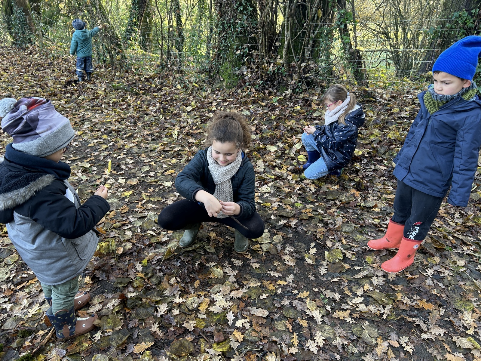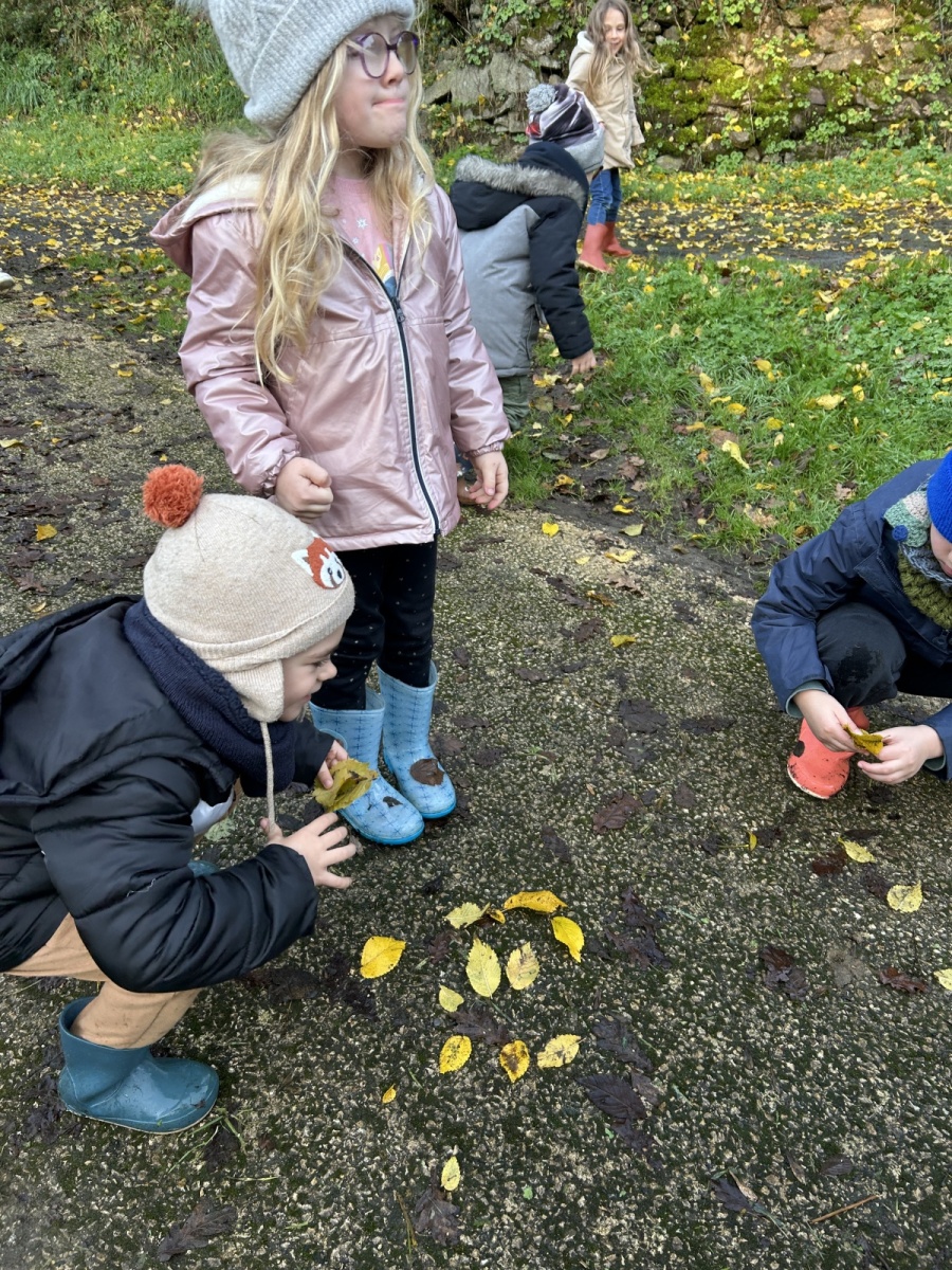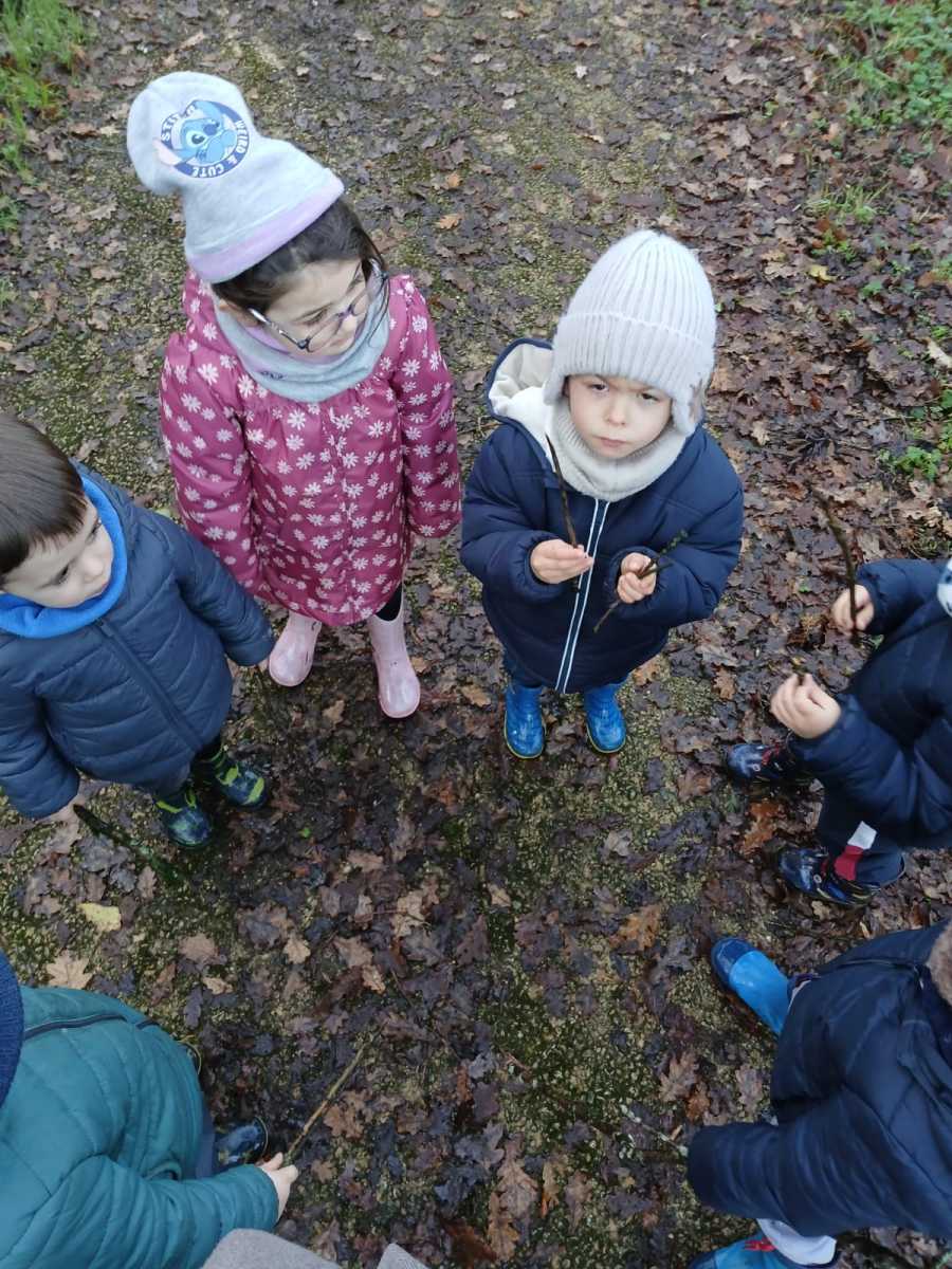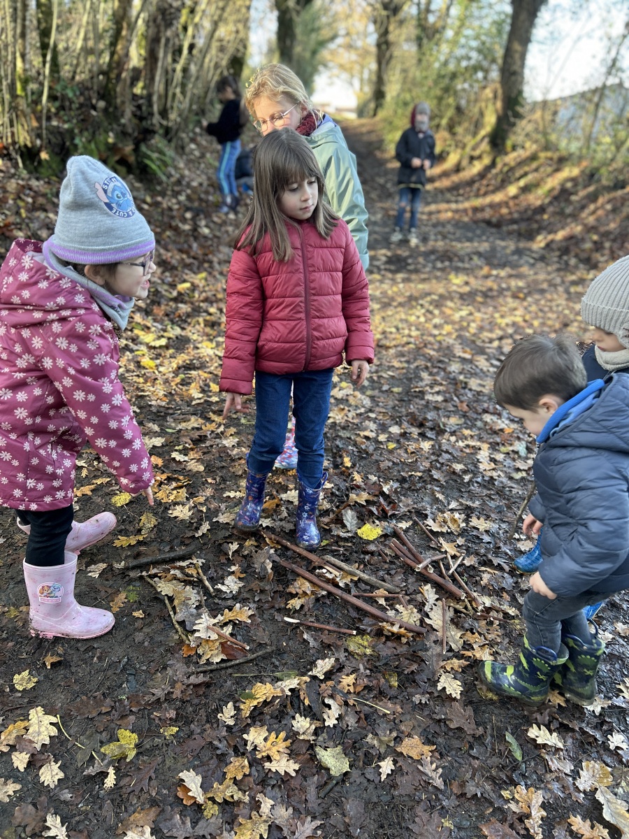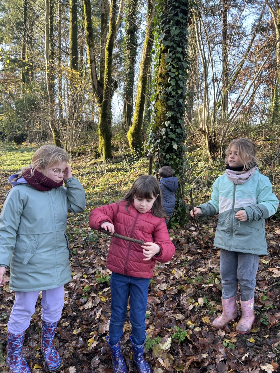 Au premier arrêt, les PS et certains MS s’entraînaient à comparer des longueurs avec des bouts de bois. Pendant ce temps, les autres MS et les GS devaient aller chercher un nombre de feuilles égal à la quantité présentée. Puis, avec les feuilles, il représentaient des formes géométriques. Les CP devaient quant à elles représenter les nombres entre 60 et 79 avec des bâtons comme dizaines et des feuilles comme unités. Les CE/CM ont réalisé une activité musicale avec Dorian et Emmy : ils devaient créer une musique avec le bruit des éléments de la nature.