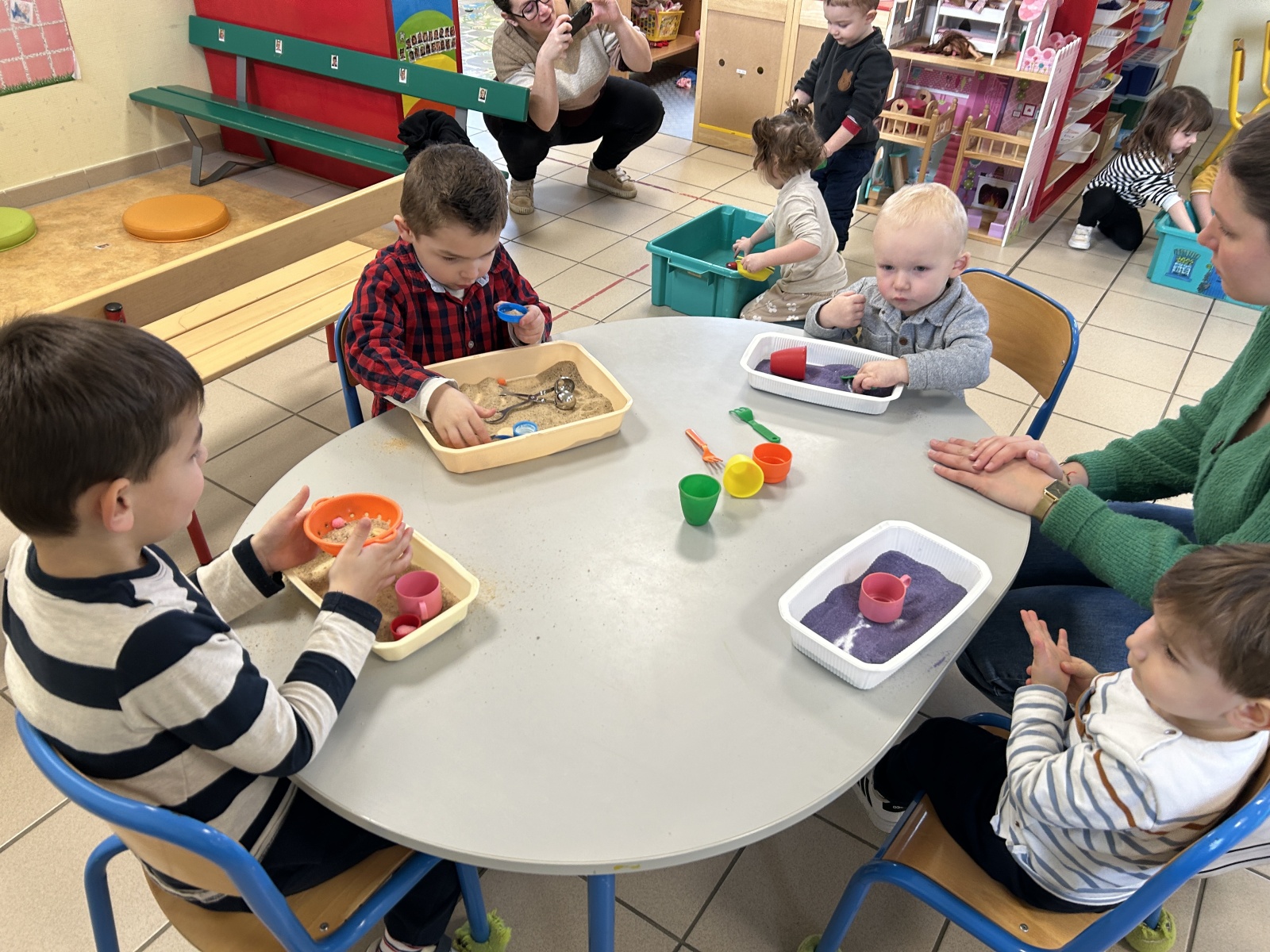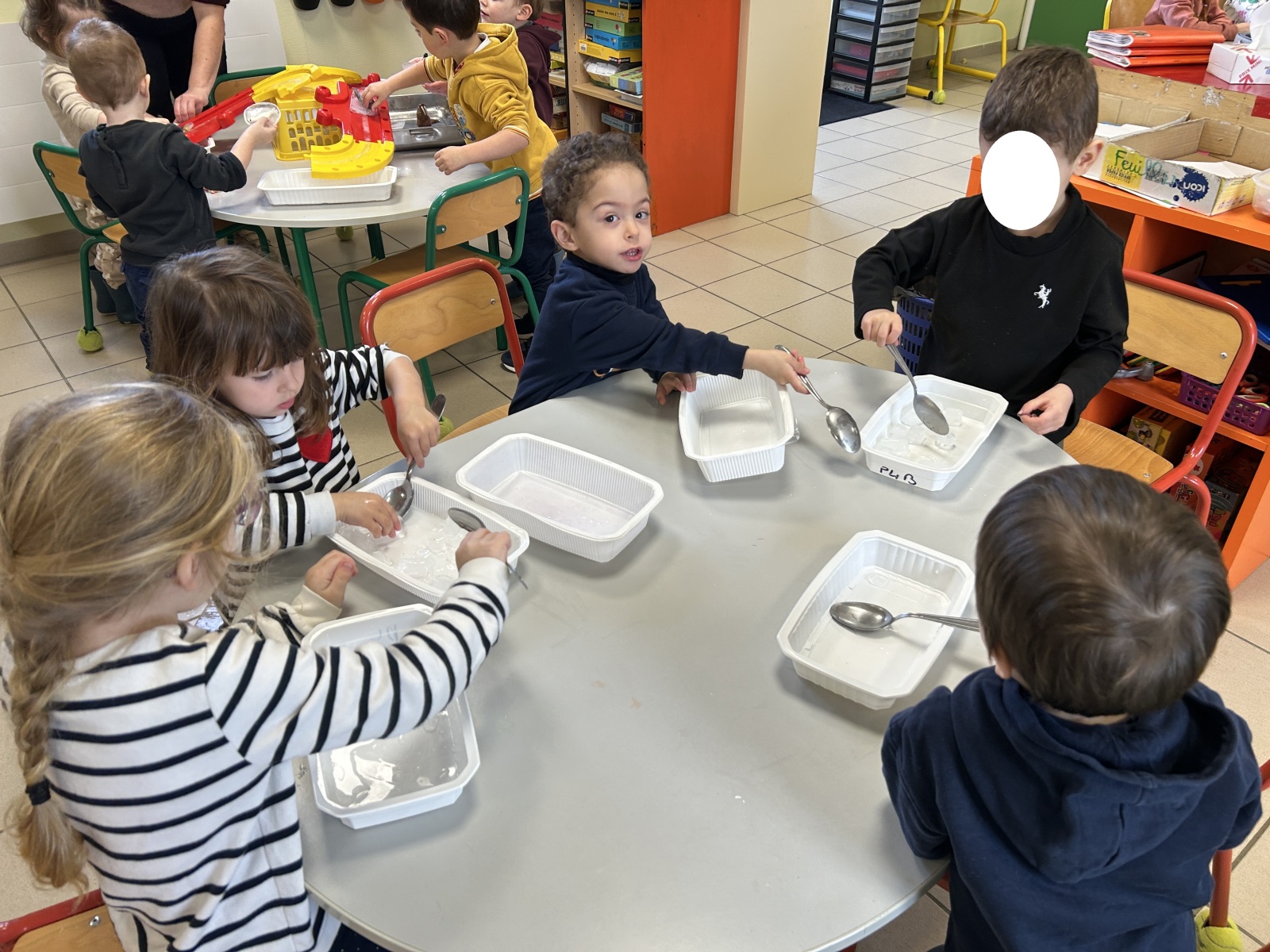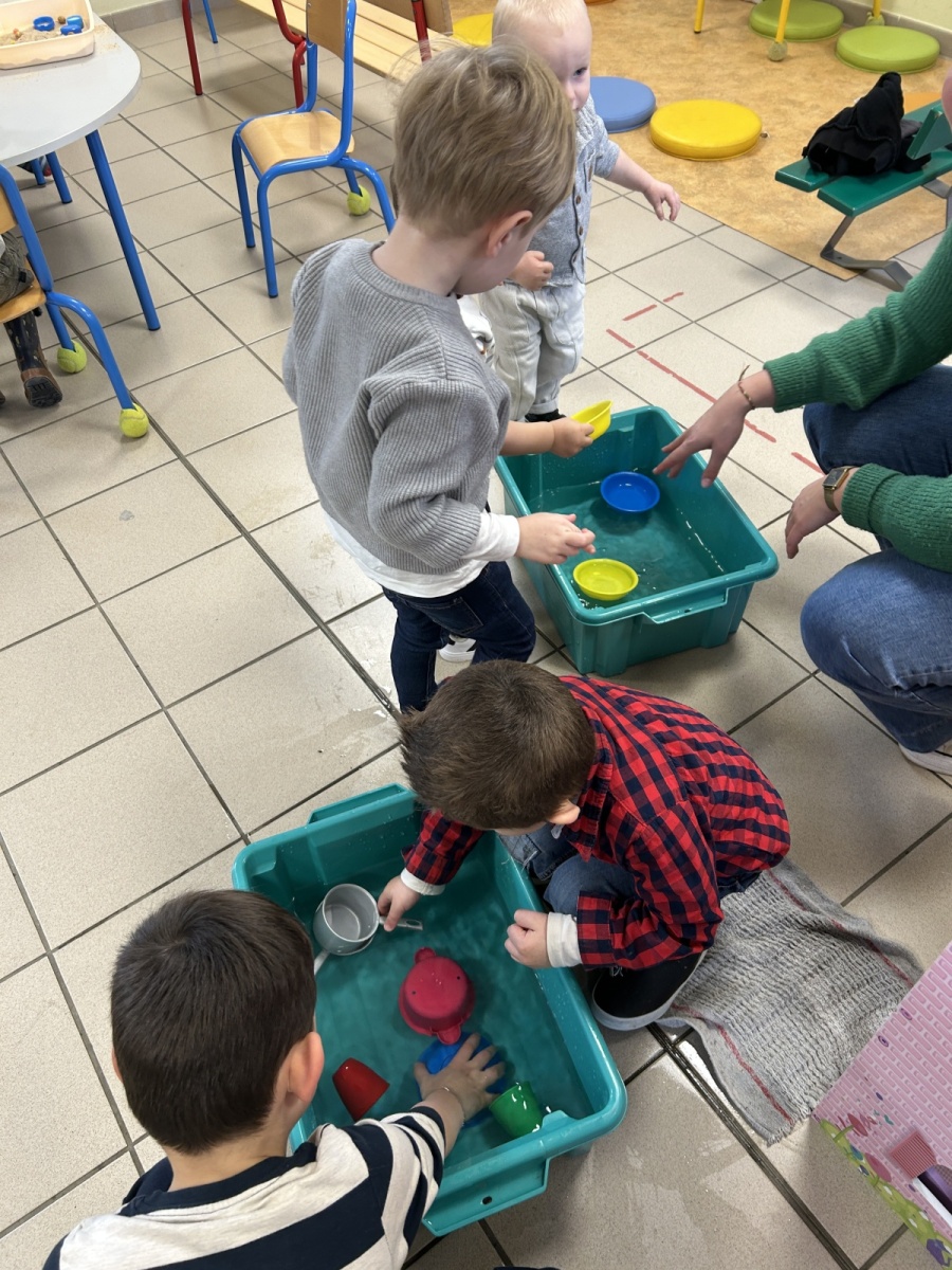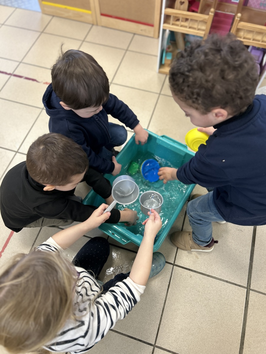 Les enfants de la crèche sont venus dans notre classe pour réaliser des activités de transvasement avec les TPS, PS et MS. Ils ont transvasé de l’eau, du sable, des glaçons et fait glisser des animaux « glacés ». Ils sont ensuite venus un petit peu en récréation avec nous.