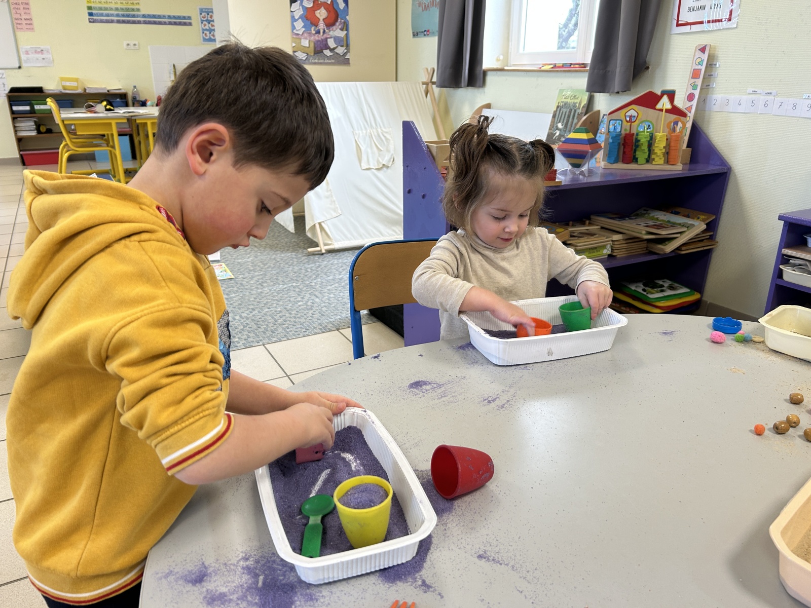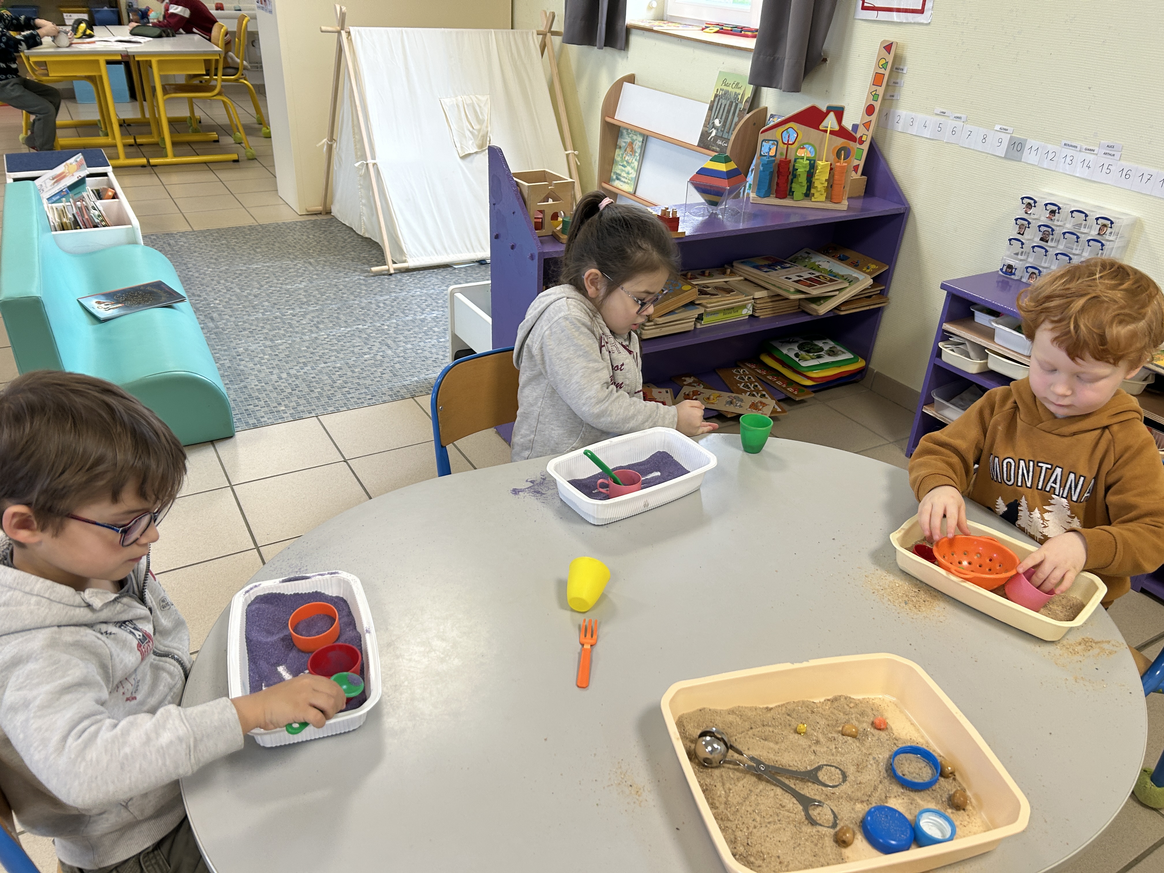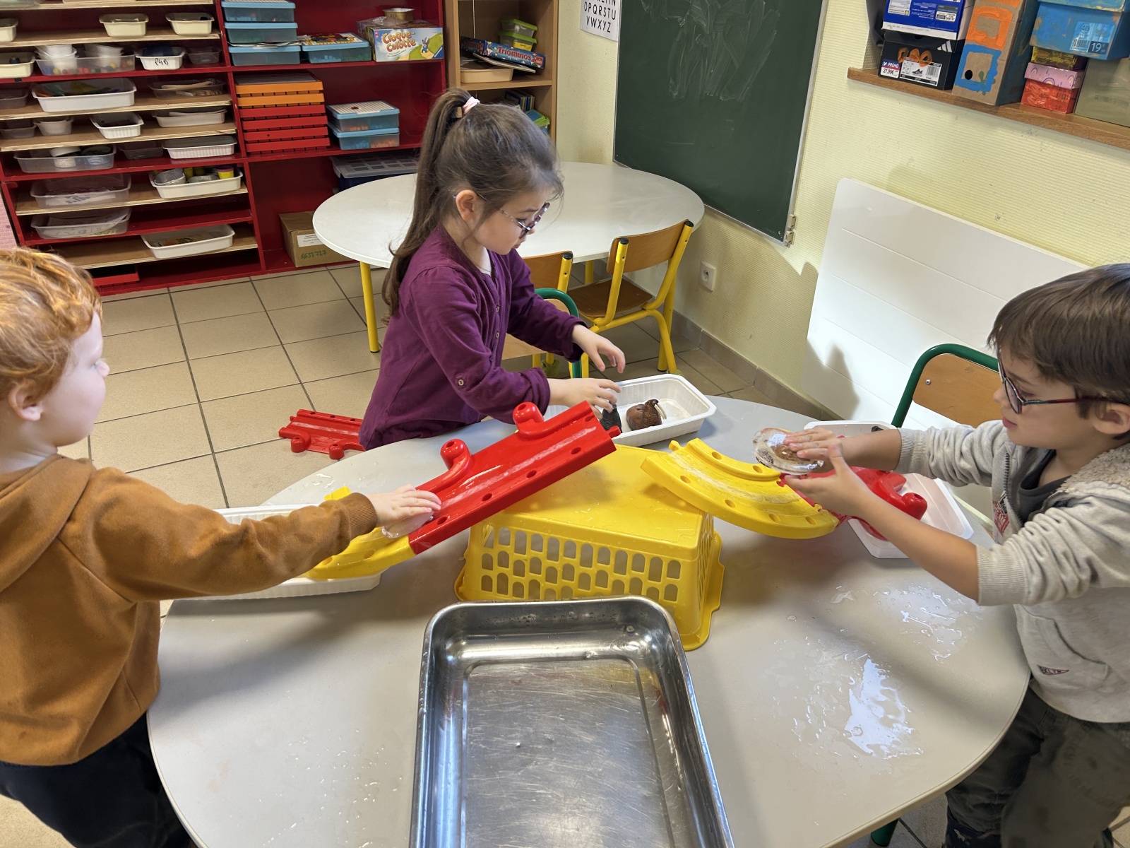 Les enfants de la crèche sont venus dans notre classe pour réaliser des activités de transvasement avec les TPS, PS et MS. Ils ont transvasé de l’eau, du sable, des glaçons et fait glisser des animaux « glacés ». Ils sont ensuite venus un petit peu en récréation avec nous.