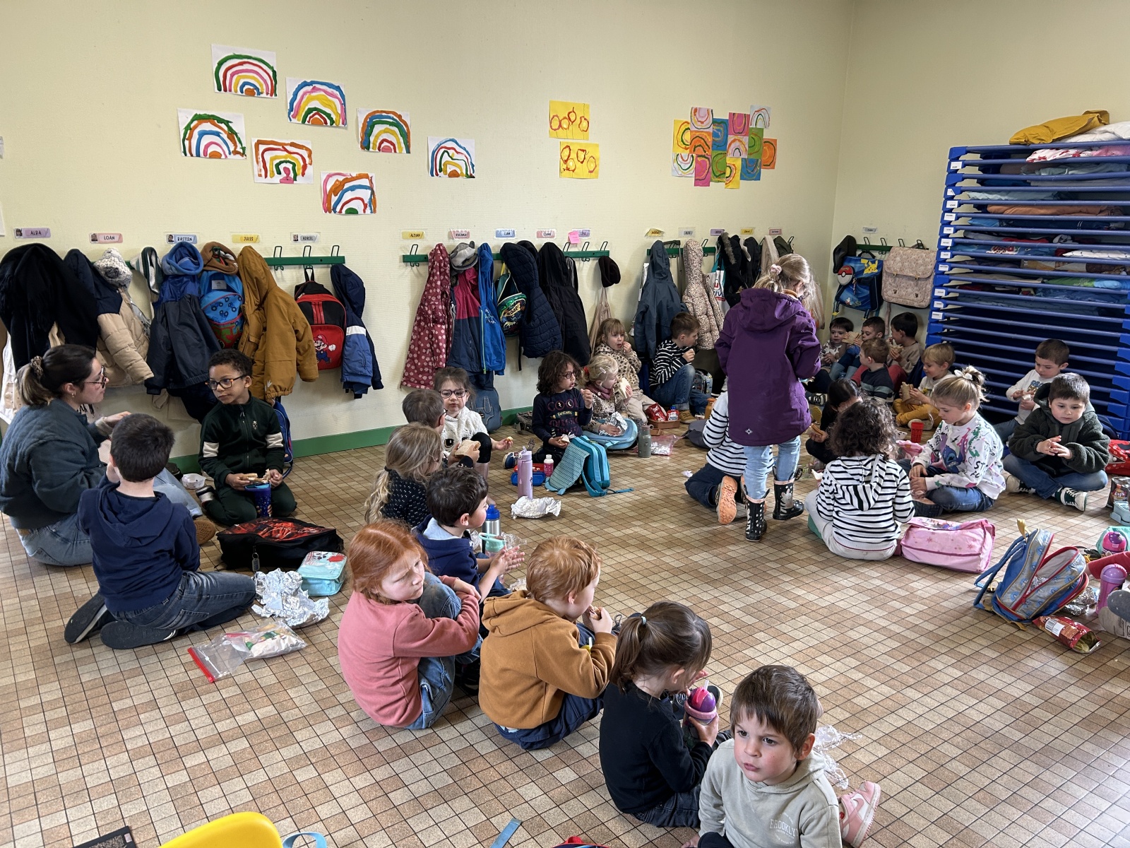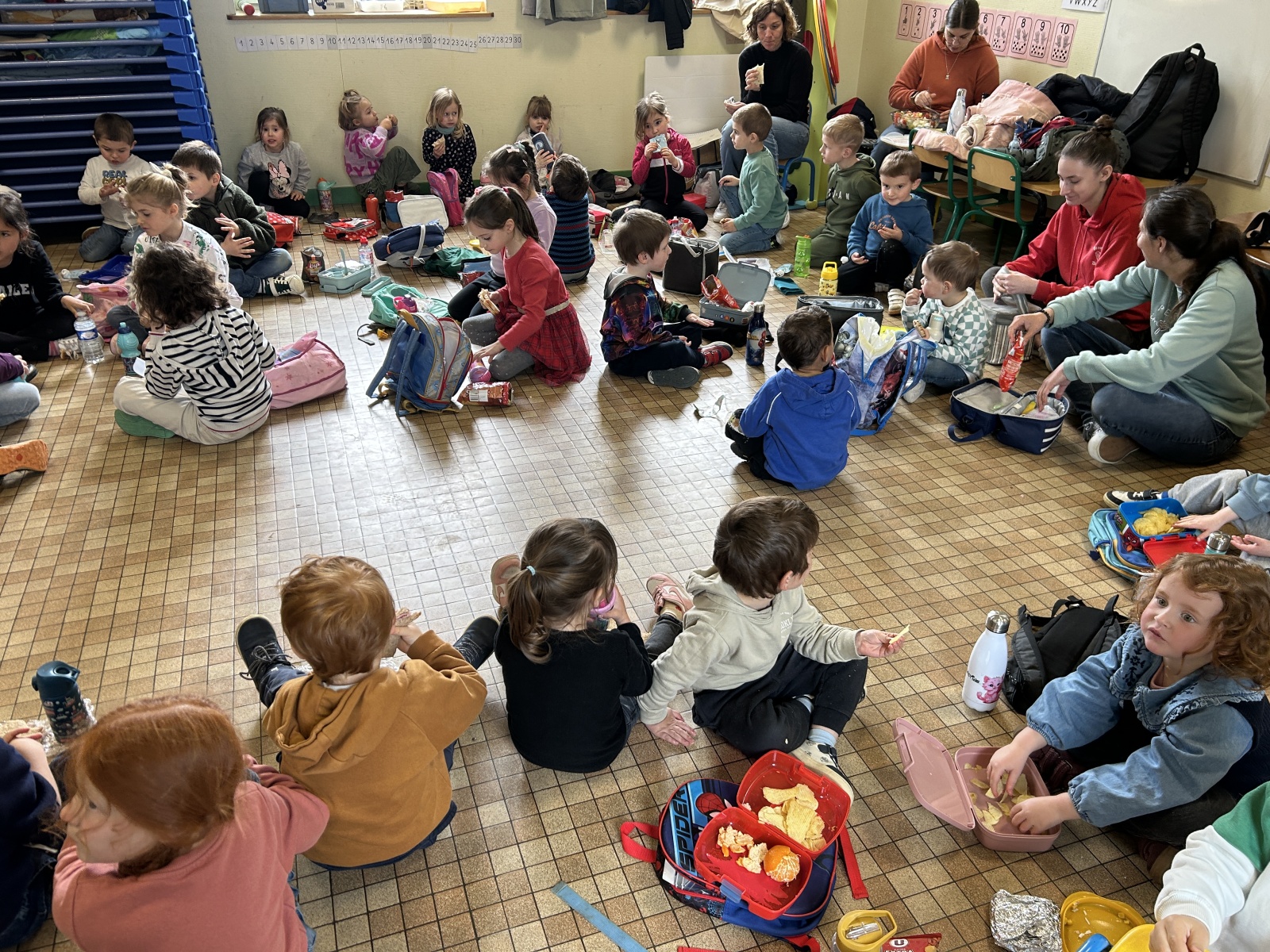 Nous avons ensuite pique-niqué à l’école : les maternelles/CP dans la salle de motricité, et les CE/CM sont les préaux.